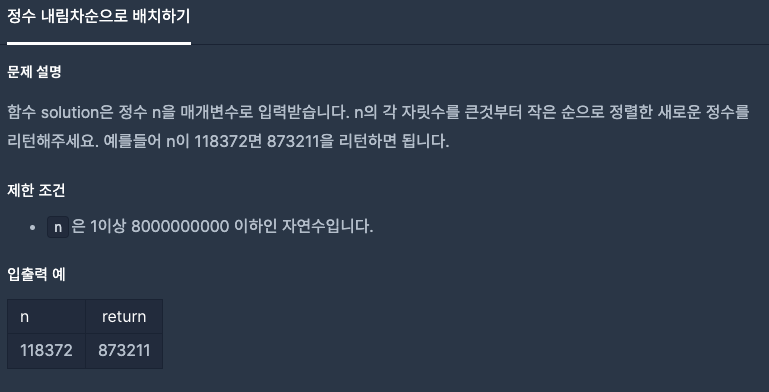 오늘은 정수 내림차순으로 배치하기 문제를 풀어보겠습니다!!!