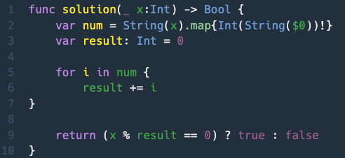그 후에 for in 문으로 한 자리씩 result에 더해주고, 삼항 연산자를 사용해서 나머지가 0일 경우 (히샤드 수 일경우)에는 true