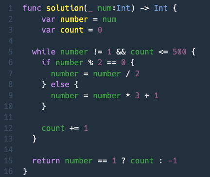 만약 number에서 2를 나눈 나머지가 0이면 number에 2를 나누고, 아니면 number에 * 3 + 1을 해줍니다.