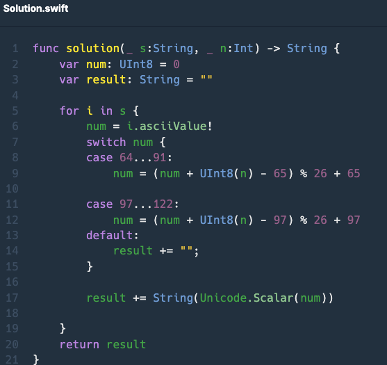 num = (num + UInt8(n) - 65) % 26 + 65