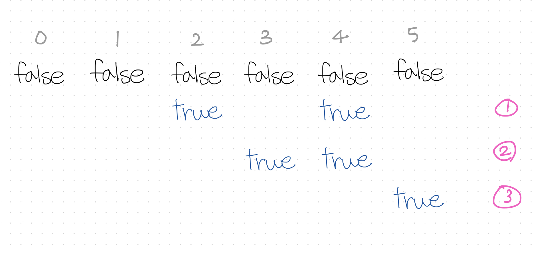 n = 5 라고 가정했을 때, 총 n + 1 = 6 개의 false로 구성된 배열이 생깁니다.