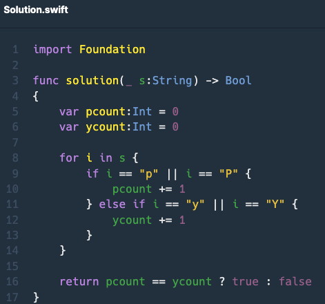 일단 문자열 s를 모두 소문자로 바꾼후에, components를 사용해서 "p"와 "y"를 찾아줍니다.