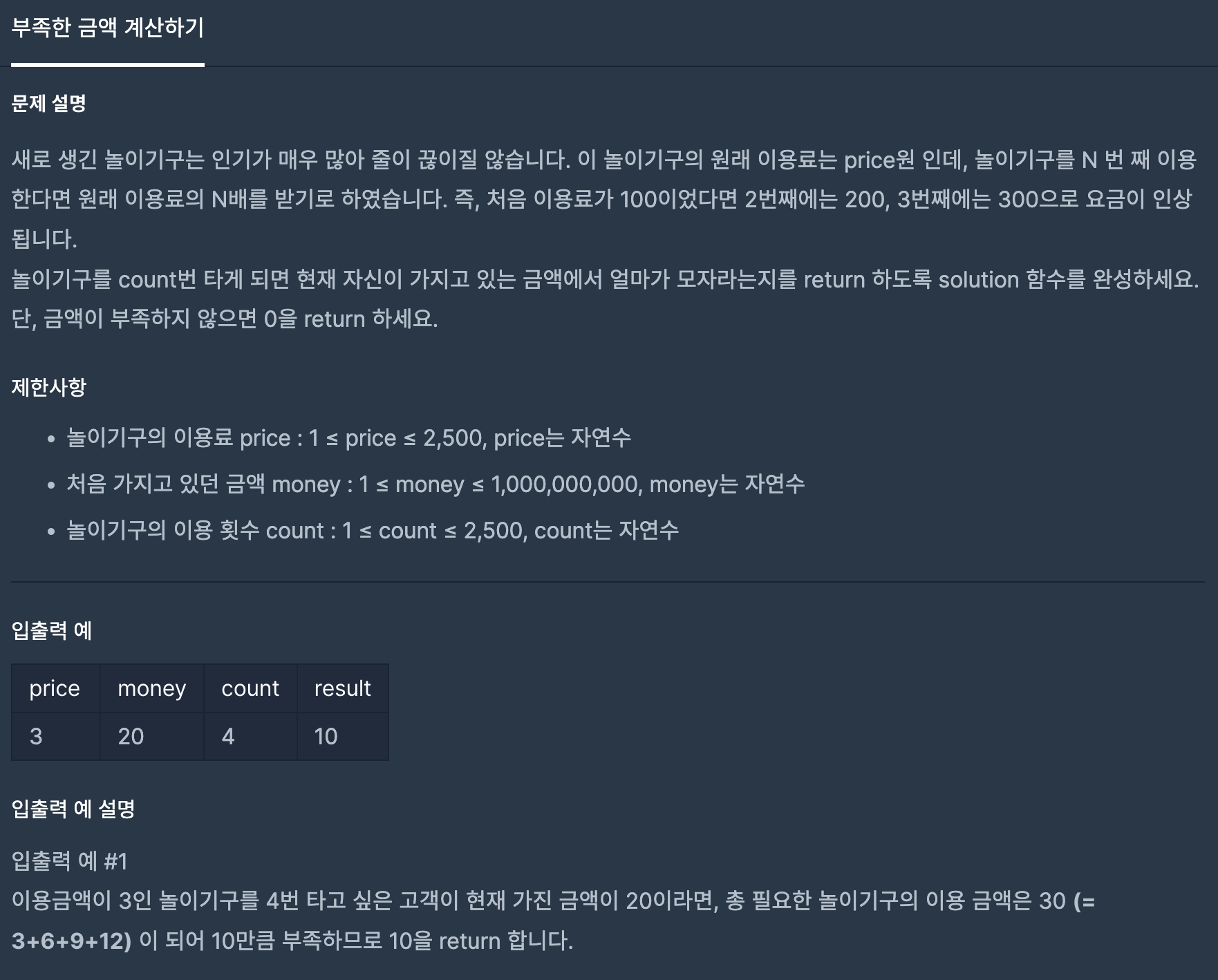 그 후에 money가 result 값보다 크면 0을 return하고, 아니면 result - money 값을 return 해 줍니다.