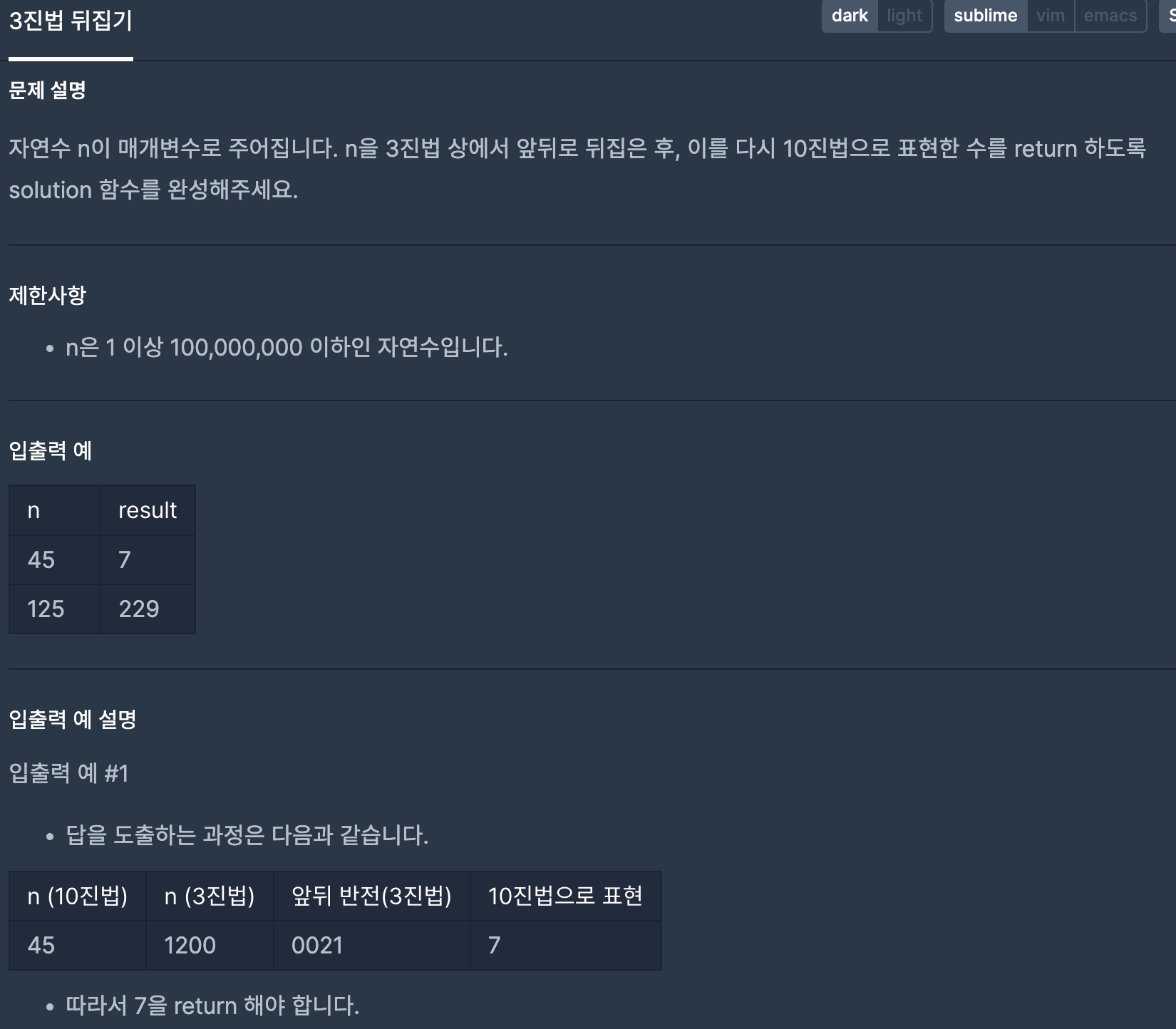저는 n 값을 3진수로 변환 -> 3진수로 변환한 값을 거꾸로 저장 -> 다시 10진수로 변환 순서로 코드를 짰는데,