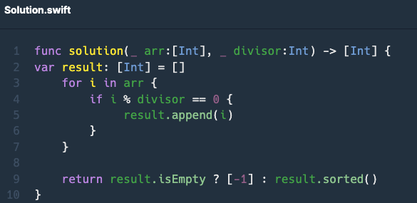 sorted로 정렬해주고, filter 고차함수를 사용해서 $0 % divisor == 0 에 속하는 값만 array에 저장해줍니다.