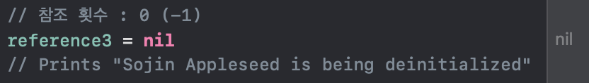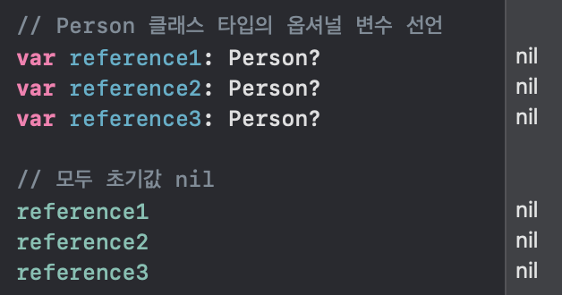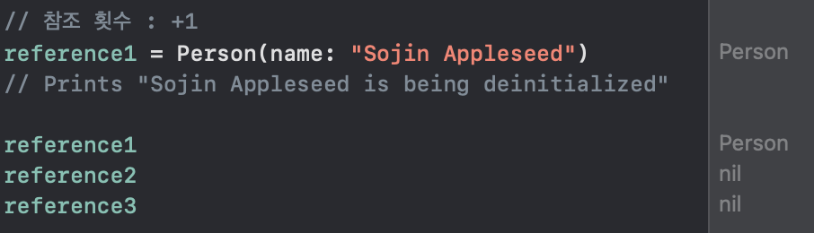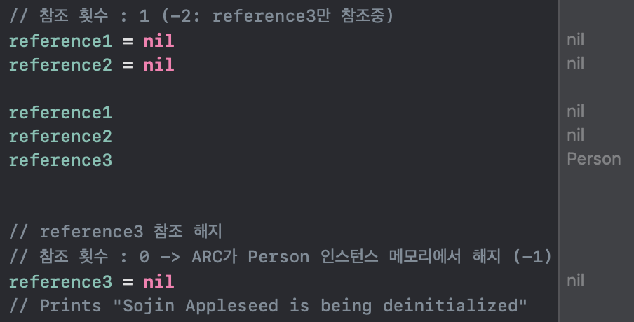 그래서 reference 1이 nil 값을 가져도 Person 인스턴스의 주소 값을 그대로 가지고 있는겁니당