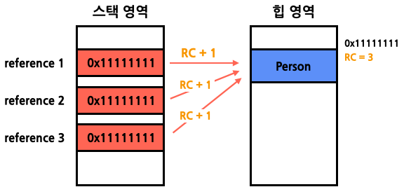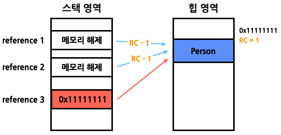 RC(Reference Count)는 Compile time에메모리의 참조 횟수(RC)를 계산하여,