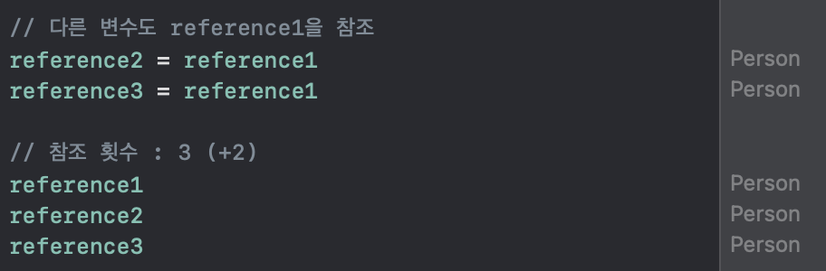 reference1변수가 Person 인스턴스를 참조하고있으니,