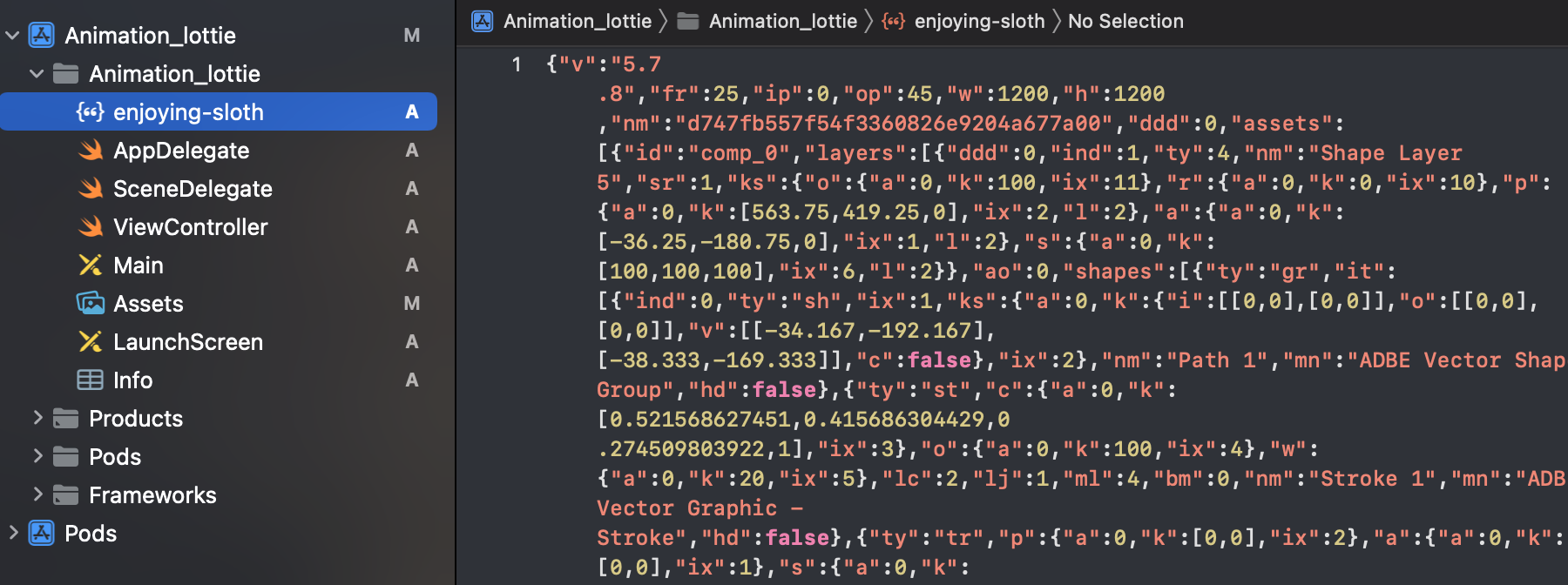 AnimationView 를 이용하면 JSON 파일을 애니메이션 데이터로 로드할 수 있습니다.