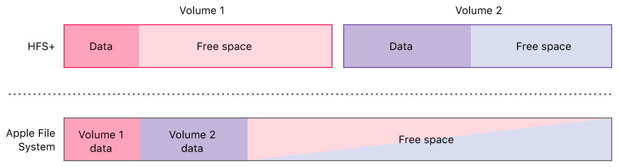 두가지를 쉽게 설명해보면 HFS+는 한 집에 방 하나 있는거고 APFS는 한 집에 여러 개의방(볼륨)이 있고, 각 방이 필요한 만큼 집 전체의 공간을 나누어 쓸 수 있는 거죠!