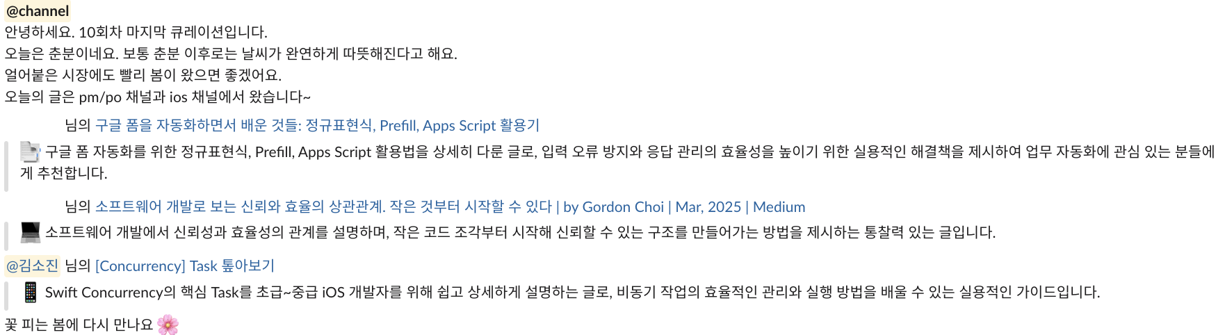 또한 글또를 하면서, 다른 사람들의 시선과 이야기를 접할 수 있었습니다. 저와는 전혀 다른 문제의식, 다른 맥락, 다른 성장을 경험하는 사람들을 보면서 ‘나만 이런 생각을 하는 게 아니구나’, ‘이렇게도 바라볼 수 있구나’ 하는 마음이 들었습니다. 그래서 자연스럽게 혼자 개발하던 저에게 협업이란 무엇일까, 팀이란 어떤 관계일까 같은 생각도 하게 되었습니다. 아마 이건 글또라는 작은 공동체가 주는 힘 덕분인 것 같습니다.