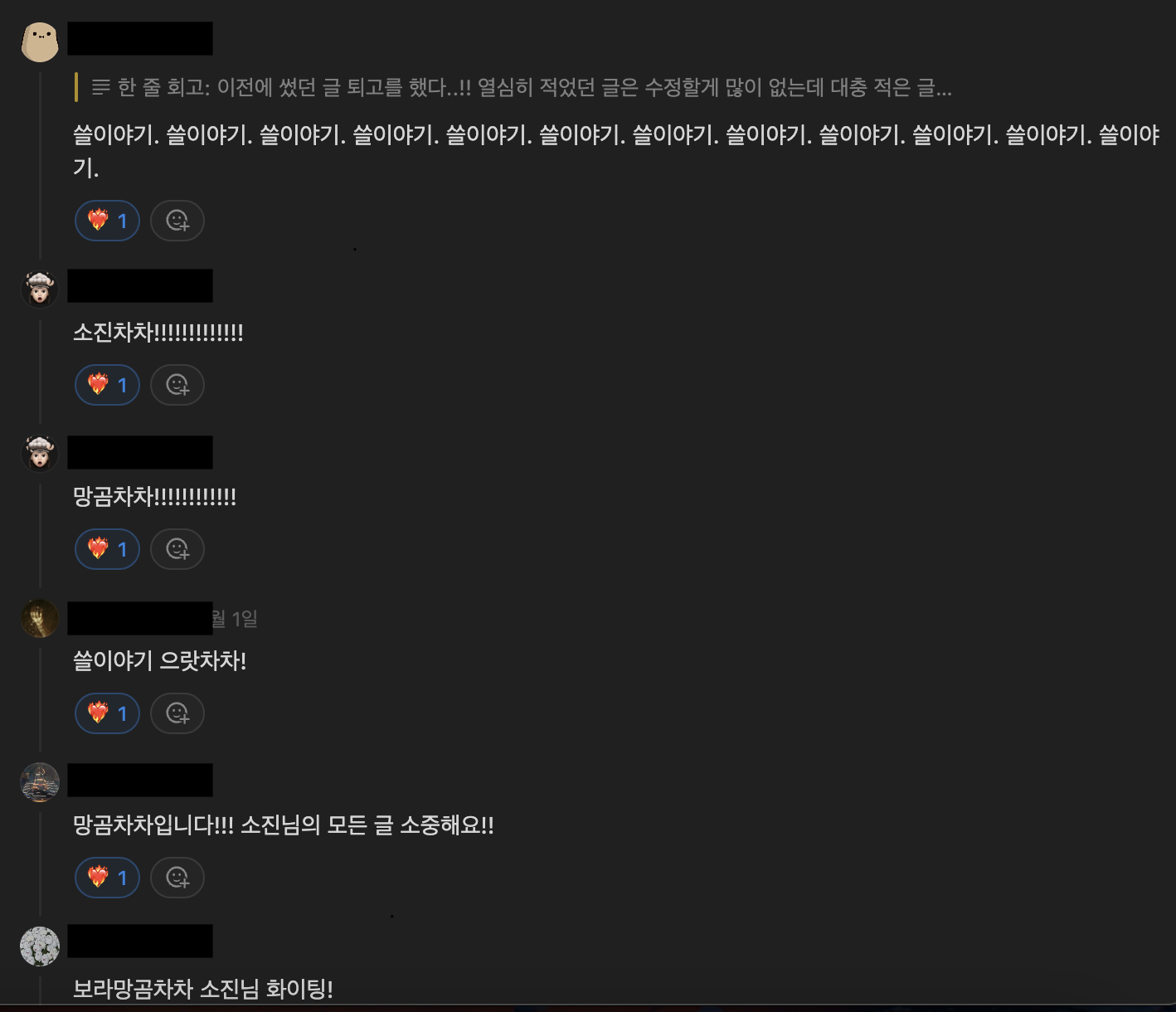 이전에 썼던 글이 쓰레기 같아서 삭제할까 고민한다고 하니 다들... 모든 글이 소중하다고 해주고요... 힘내라고 해줘요...