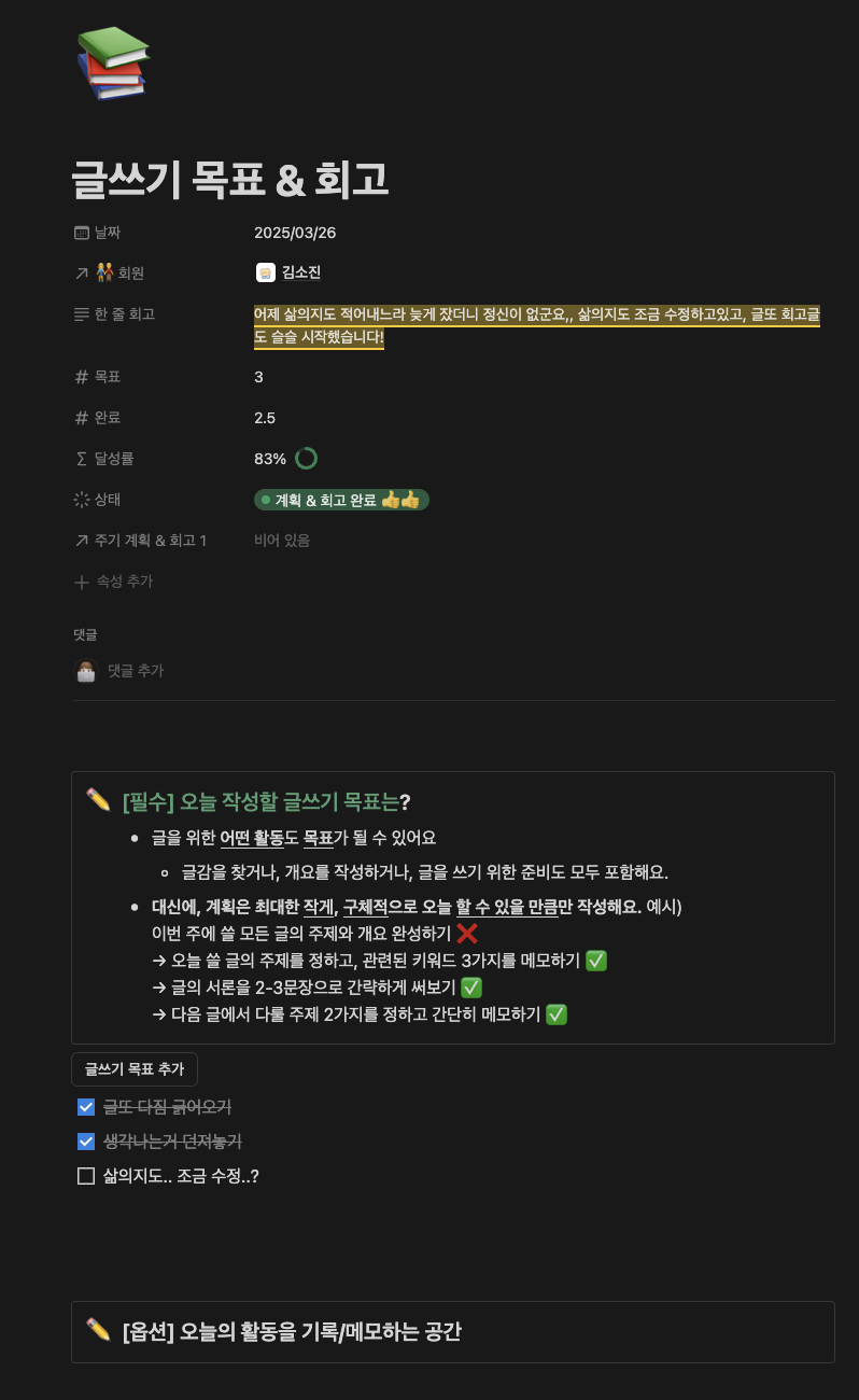매 주기의 첫 째 주 월요일에는 주기 목표와 지난 주기에 대한 회고 및 개선할 점에 대해서 적고, 이후에는 하루하루 목표를 적고 한 줄 회고를 적고 이야기를 나눕니다!!