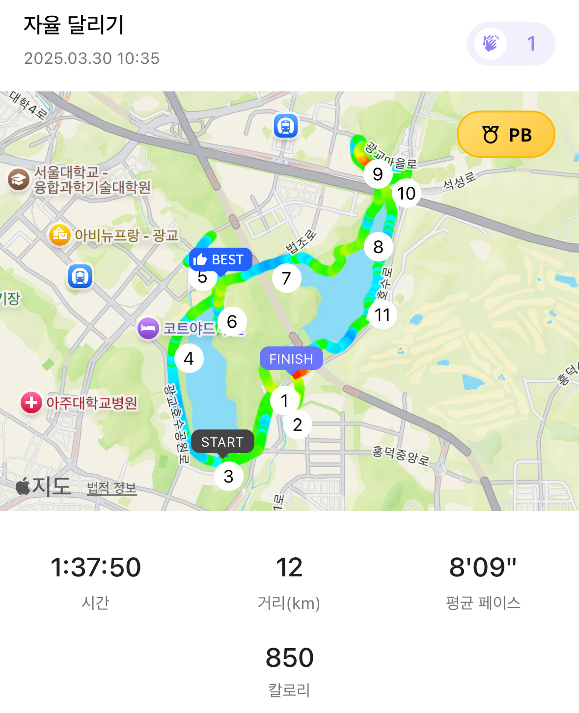 세원님과 서인님이 머나먼 광교까지 와주셔서 같이 달려주셨는데, 처음 뛰어보는 10km라 걱정을 많이한 것치고 잘 뛰었습니다!