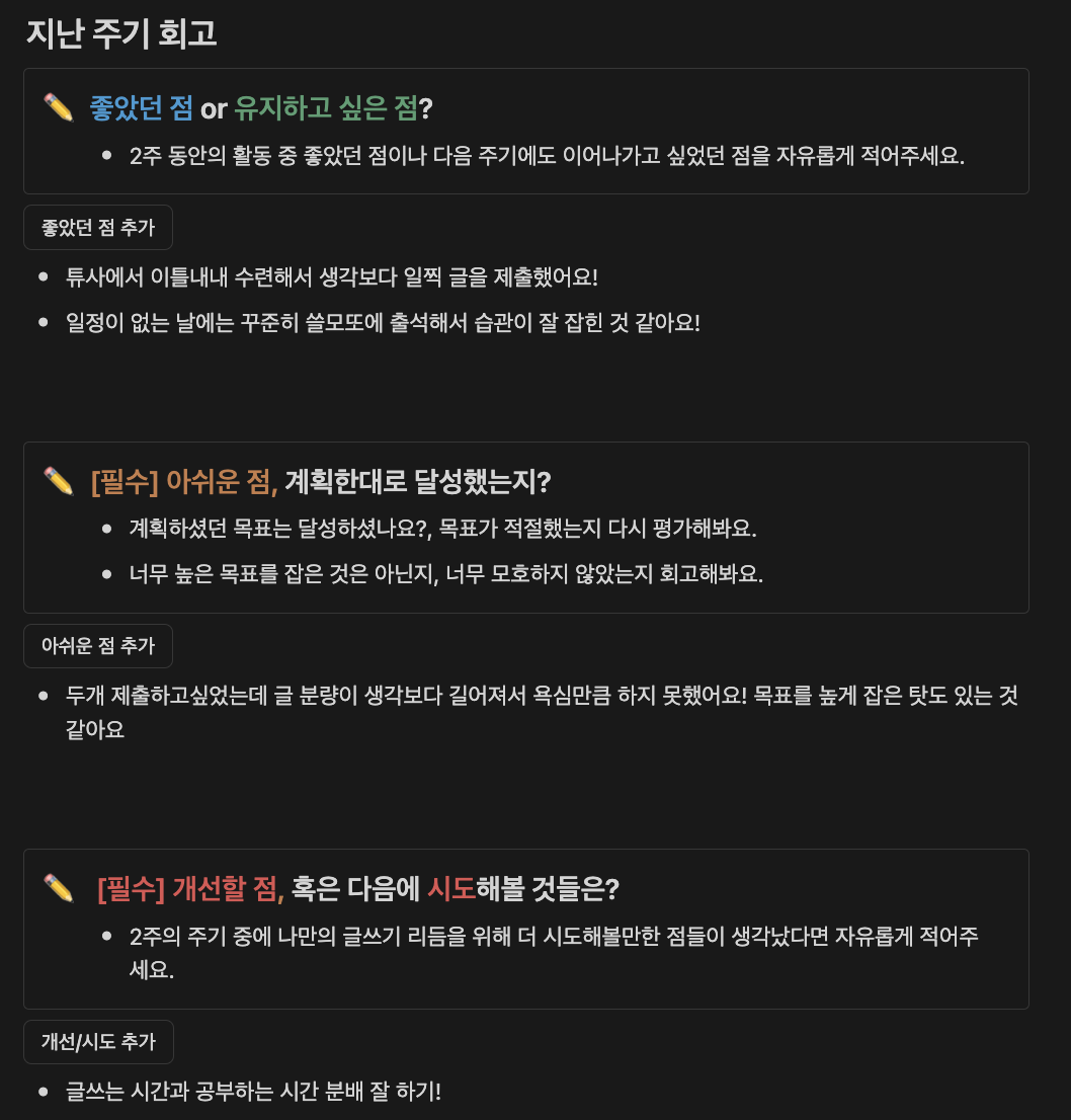 매 주기의 첫 째 주 월요일에는 주기 목표와 지난 주기에 대한 회고 및 개선할 점에 대해서 적고, 이후에는 하루하루 목표를 적고 한 줄 회고를 적고 이야기를 나눕니다!!