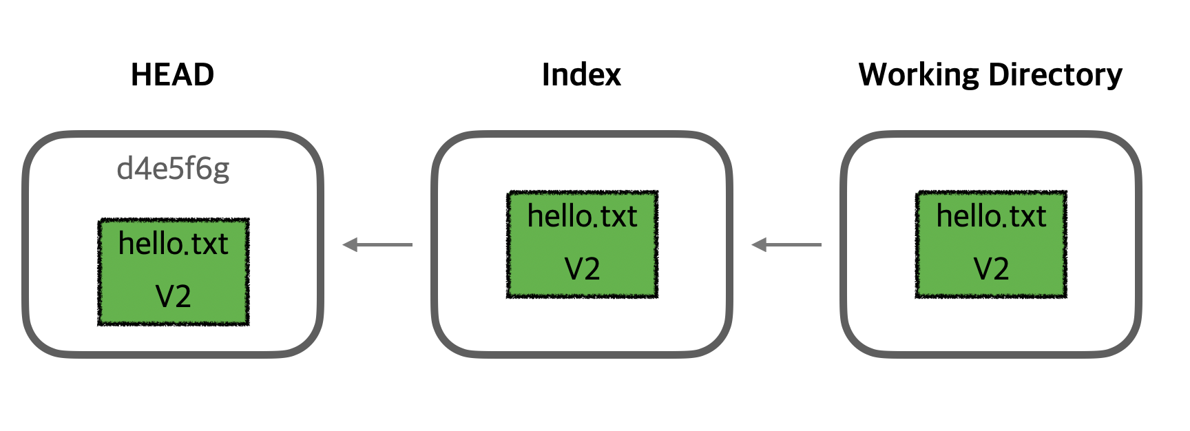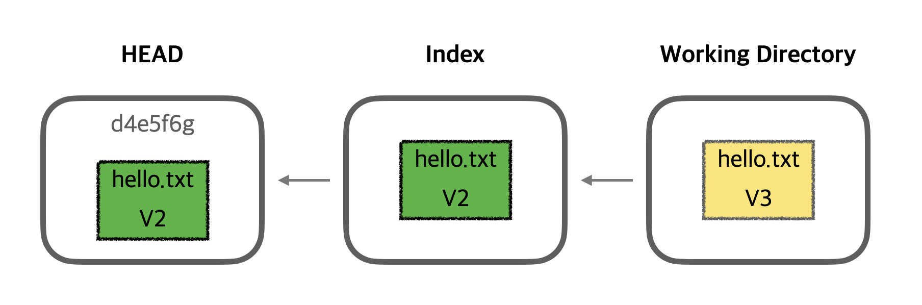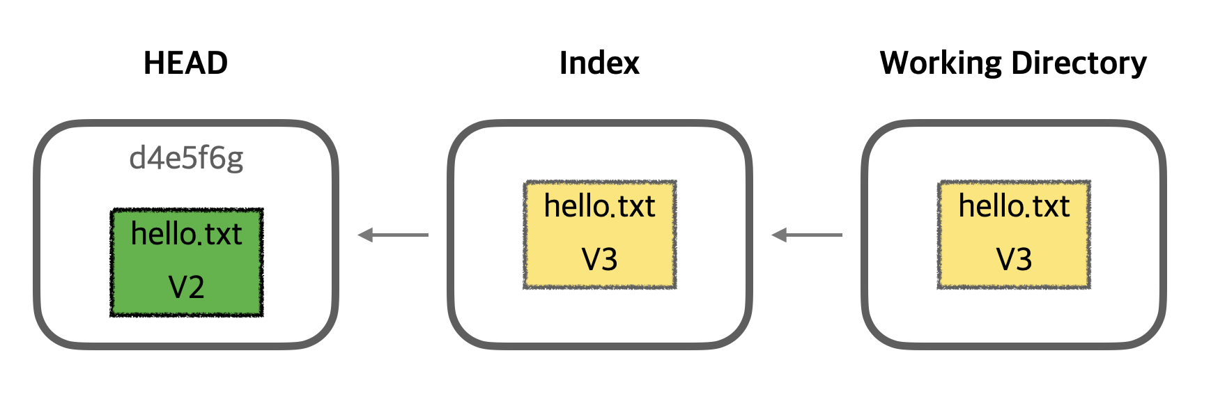 이미지를 보면, HEAD는 이전 커밋(V2)로 이동했지만, Index와 Working Directory에는 여전히 최신 커밋(V3)의 내용이 남아 있는 것을 확인할 수 있습니다.
