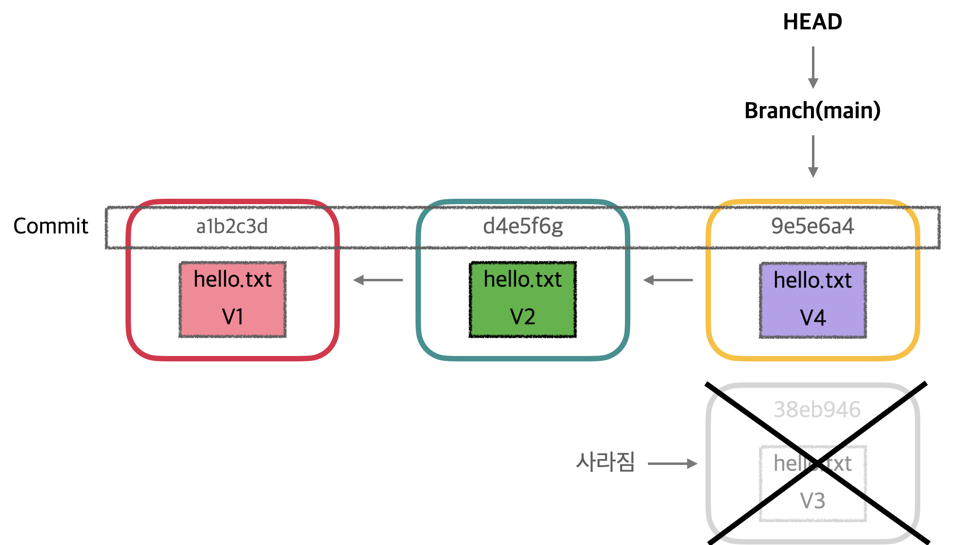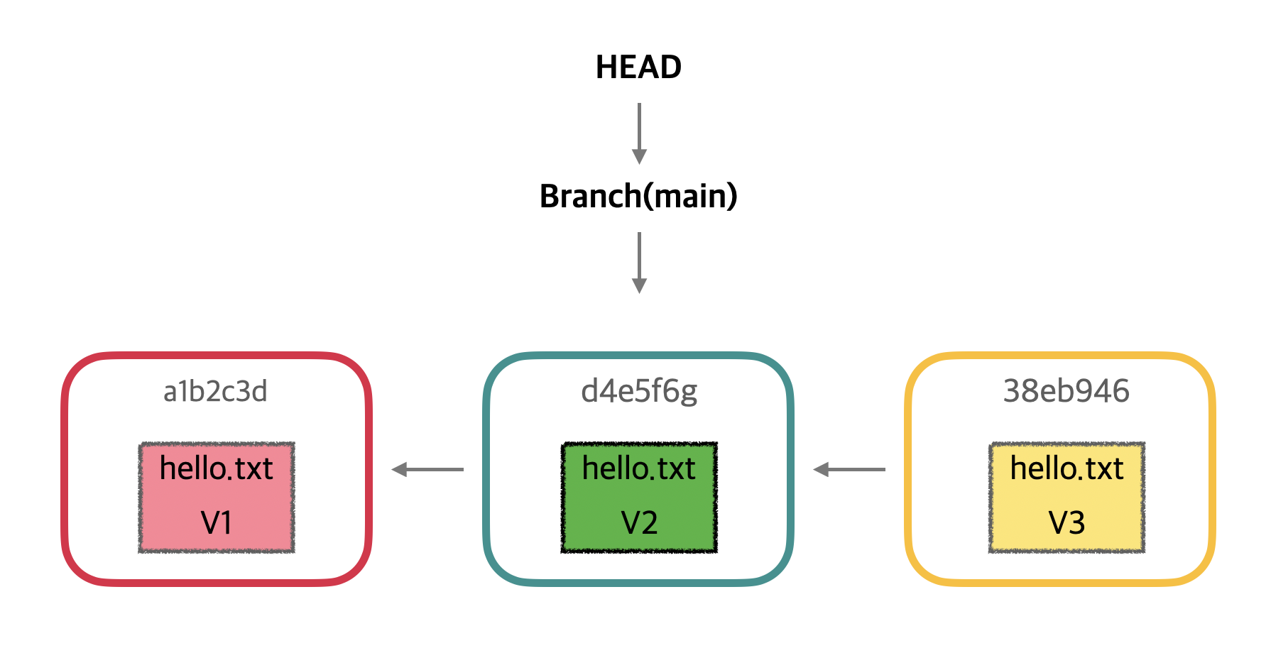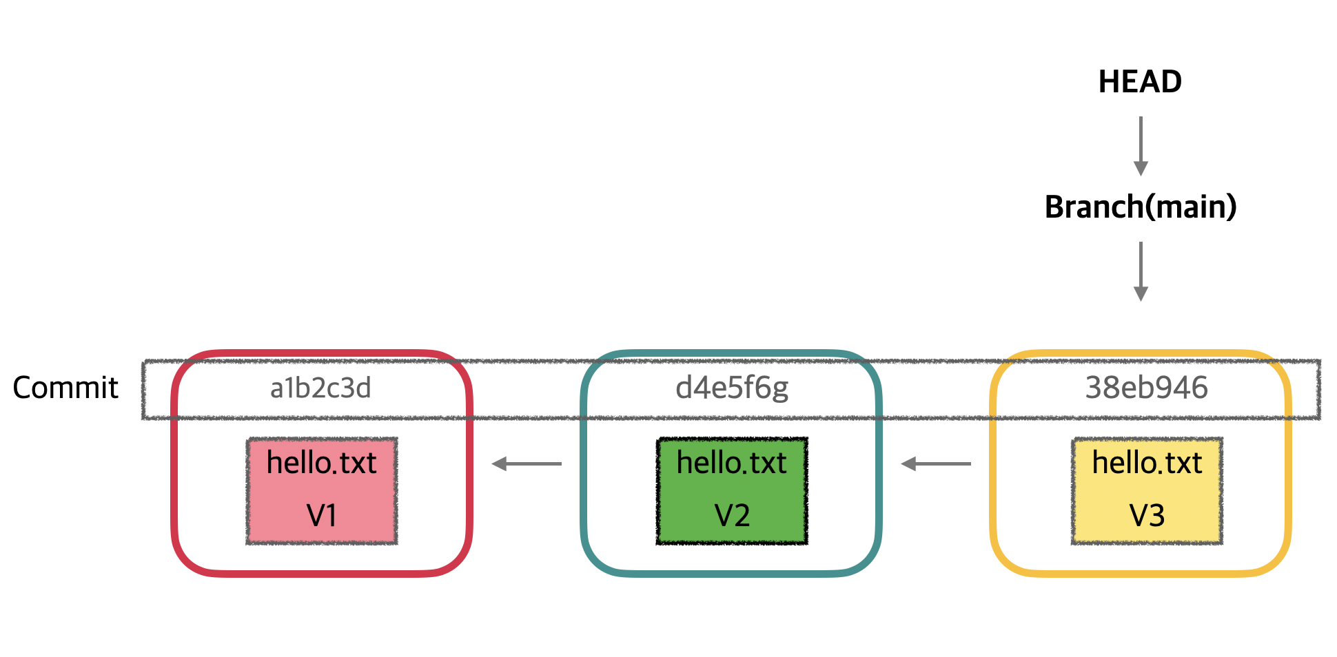 각 박스는 커밋을 나타내며, hello.txt 파일의 변경 이력을 V1 → V2 → V3 순서로 보여줍니다.