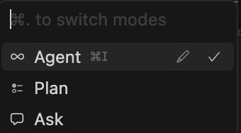 Cursor에는 Agent, Ask, Plan 모드가 있습니다.