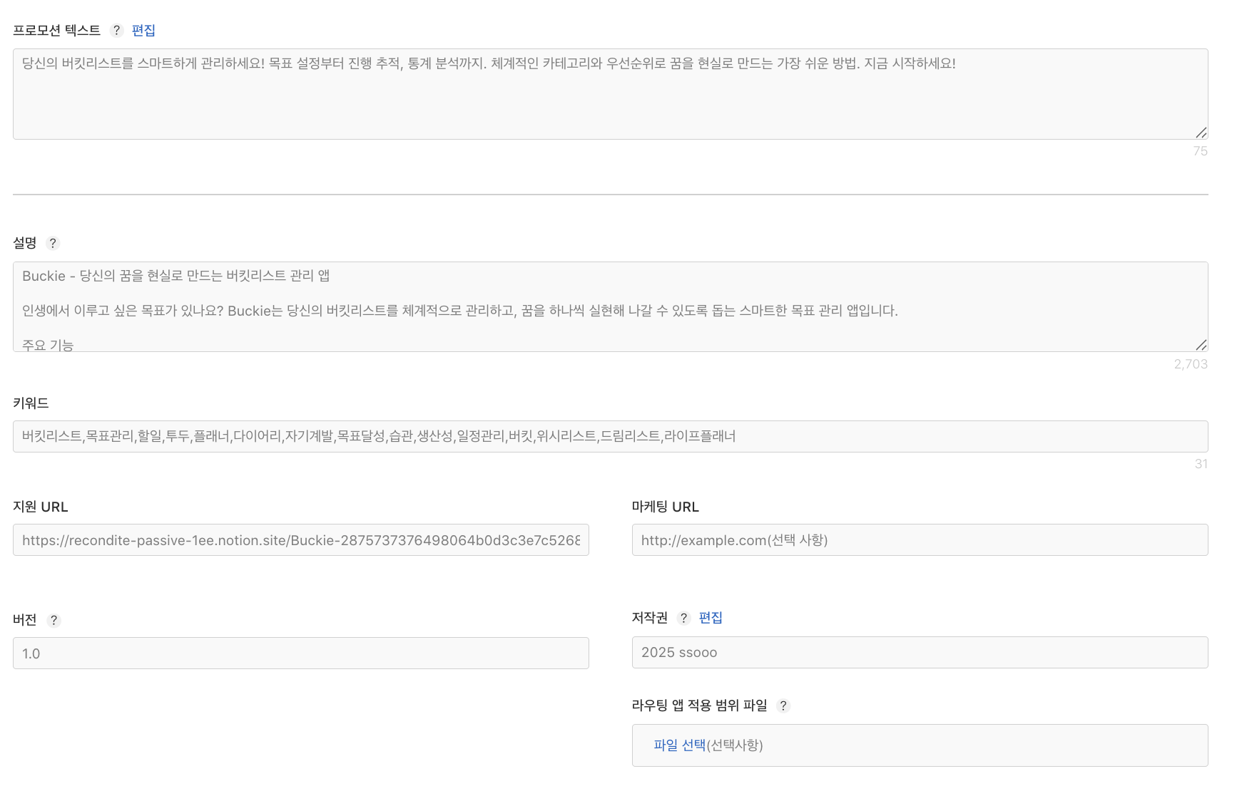 앱 출시 정보 입력해야되는데, 앱 부제와 프로모션 텍스트, 설명, 키워드 알려줘