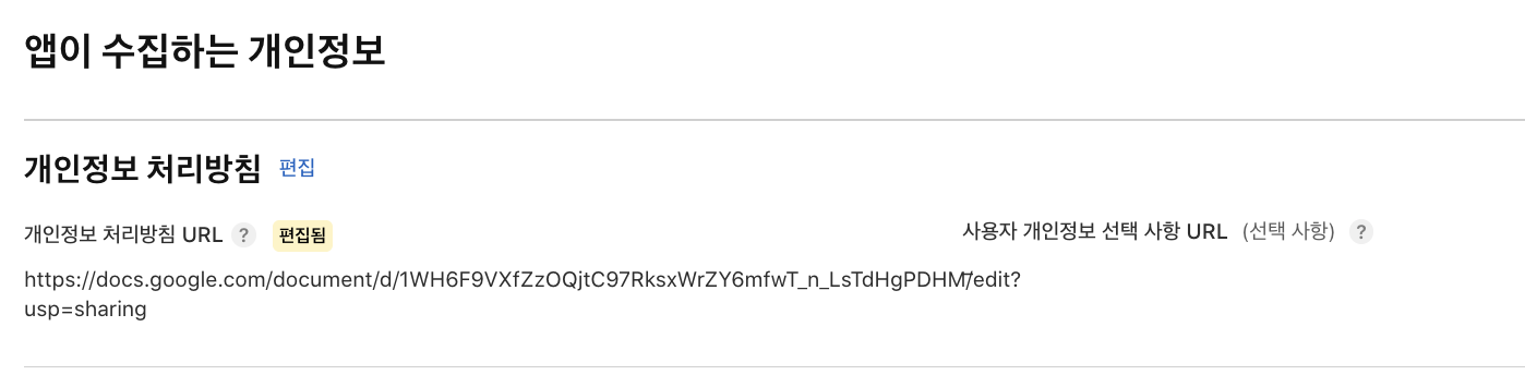 지원 URL과 개인정보 처리방침은 따로 게시해야되기때문에 기준에 맞게 생성해달라고 요청합니다.