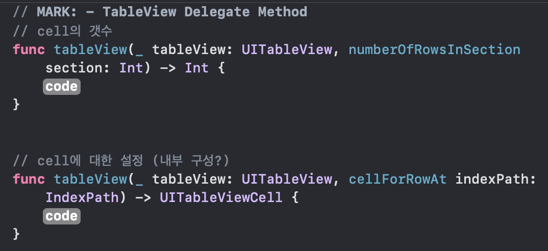 numberofRowsInSection, cellForRowAt 을 필수적으로 구현해주어야합니다.