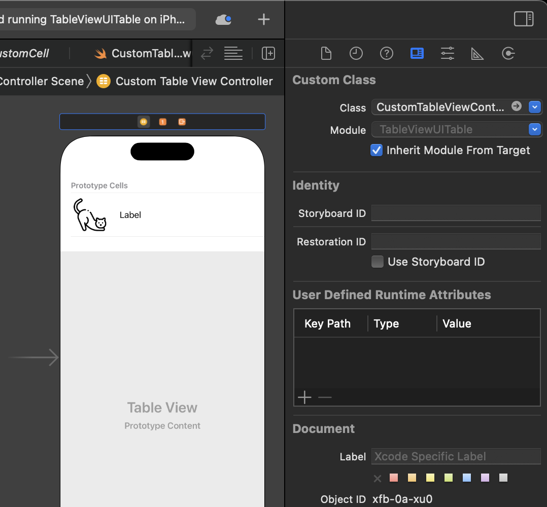 아까 만든 Table View Controller에 방금 만든 Class를 지정해줍니다.