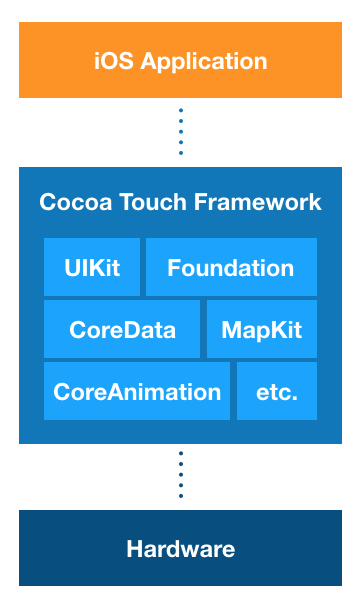 - Cocoa Touch는 핵심 프레임워크인 UIKit과 Foundation을 포함하며 iOS에서 동작하는 앱을 개발하기 위해 사용됩