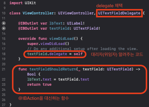 이 textFieldShouldReturn은 UITextFieldDelegate 안에 정의되어있는 함수입니다.