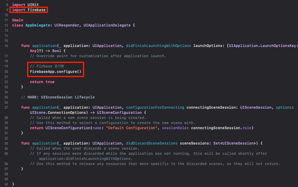 Firbase를 import 해주고 FirebaseApp.configure() 코드를 추가해주면 끝납니다!!!