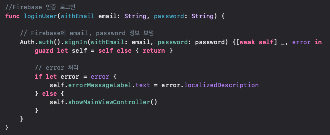 signIn 을 이용하여 email과 password 값을 Firebase에 넘겨주어 로그인합니다.