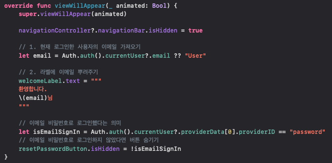 textfield에 입력 받은 값을 email, password에 각각 넣어줍니다.