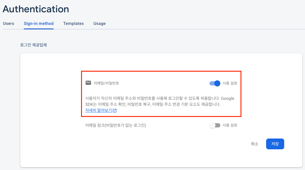 Authentication -> Sign-in method -> 이메일 / 비밀번호 클릭 해줍니다.