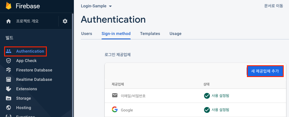 Authentication 메뉴 -> Sign-in method 를 클릭 후,