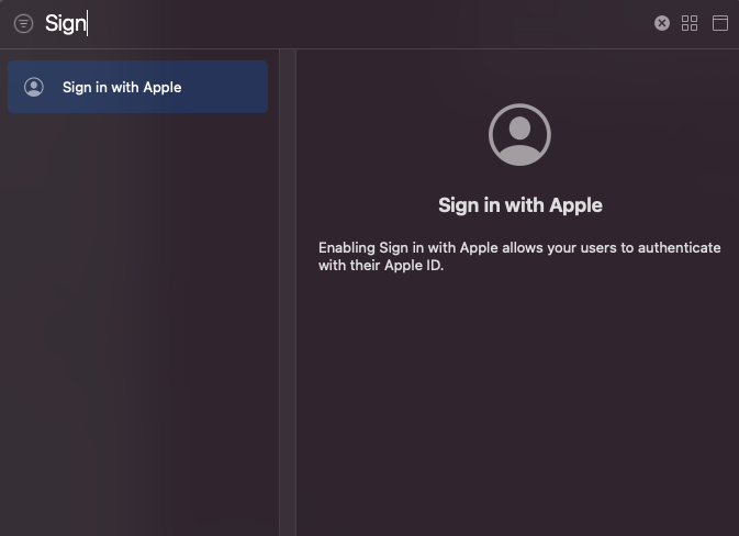 검색창에 Sign의 텍스트를 입력해주고 해당 Sign in with Apple을 선택합니다.