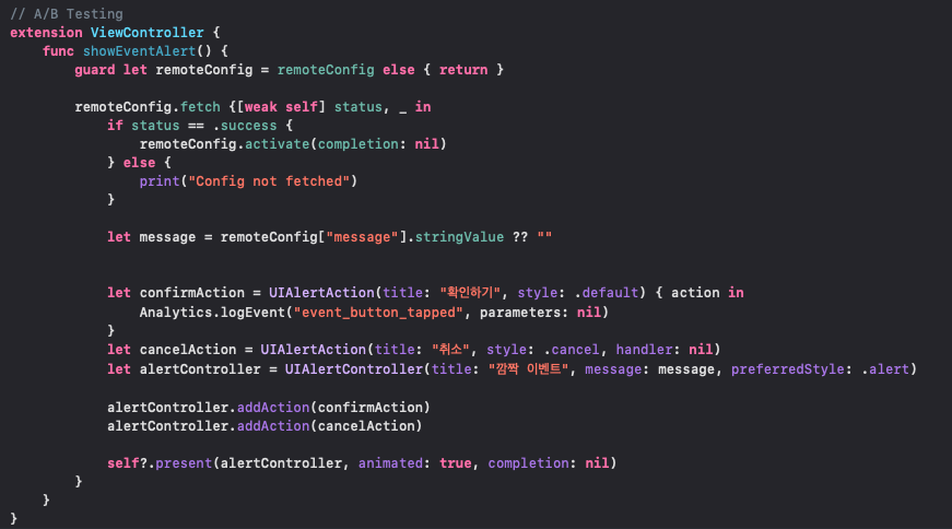 code는 이전에 했던 Remote Config 코드와 유사합니다 :D