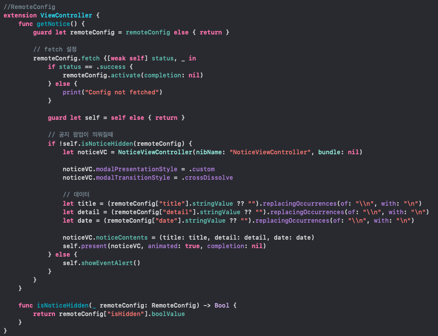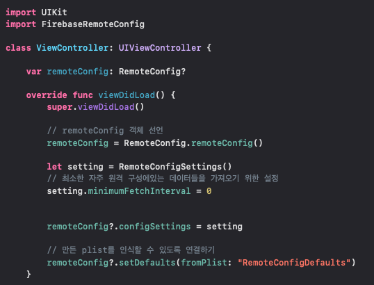 viewDidLoad에 객체 선언, 원격 구성 Fetch할 때 필요한 설정을 해줍니다.