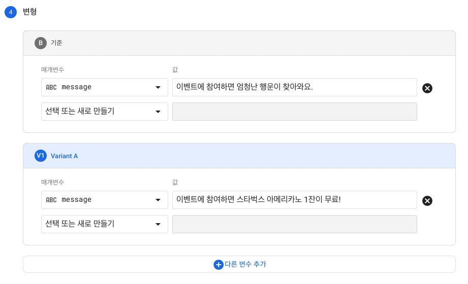 만약 기존 문구가 떴었다면 Variant A를 선택해주고,