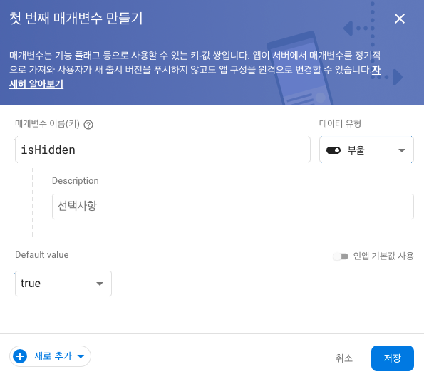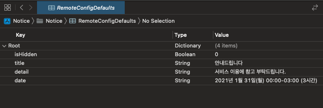 원격 구성은 Key - Value 형태의 스토리지이기때문에 Type은 Dictionary로 지정하고 아래와 같이 기본 값을 설정해줍니다.