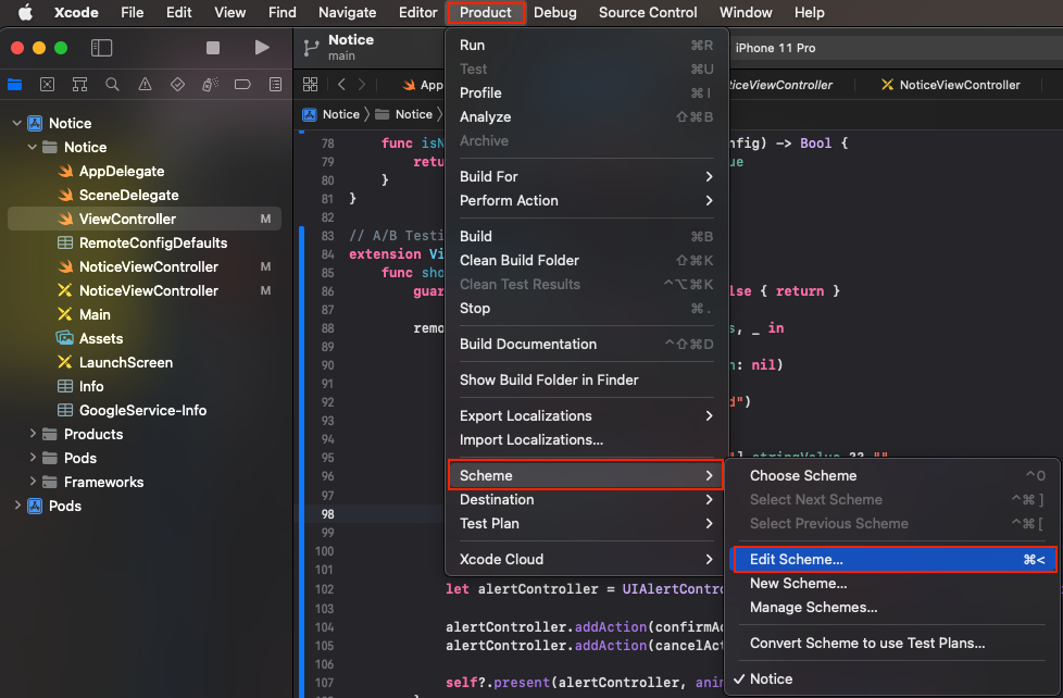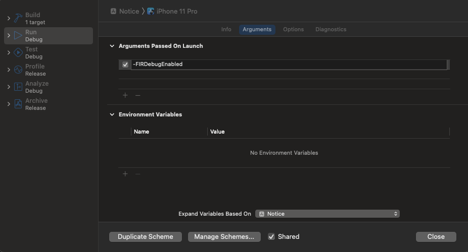 Analytics DebugView 기능을 사용하기위해서는 프로젝트에 scheme를 추가작업이 필요합니다.