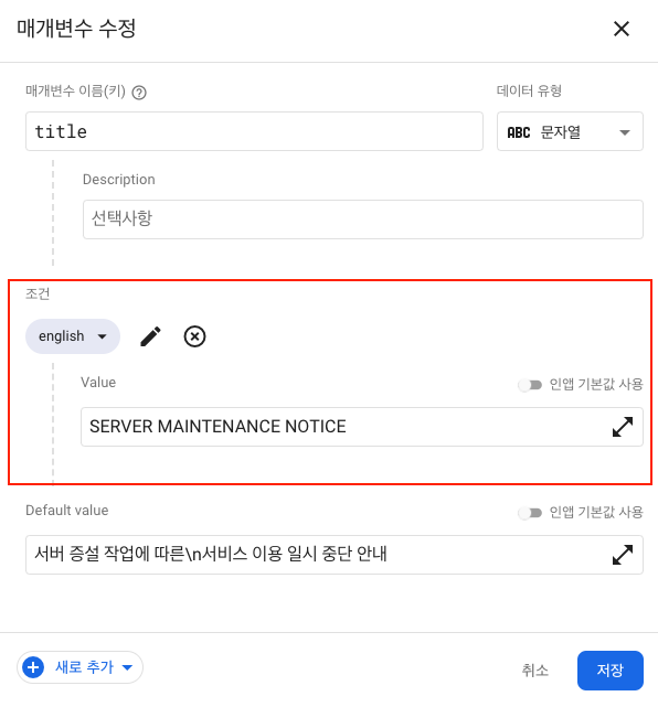 이름과 적용 조건에서 언어를 선택하고 적용하고 싶은 특정 언어를 선택해줍니다.