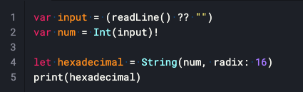 let hexadecimal: String = String(Int(binary, radix: 2)!, radix: 16)