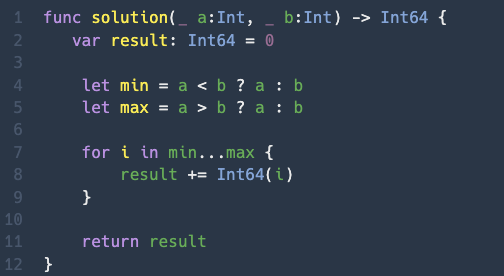 return Int64(a + b) * Int64(max(a, b) - min(a, b) + 1) / Int64(2)