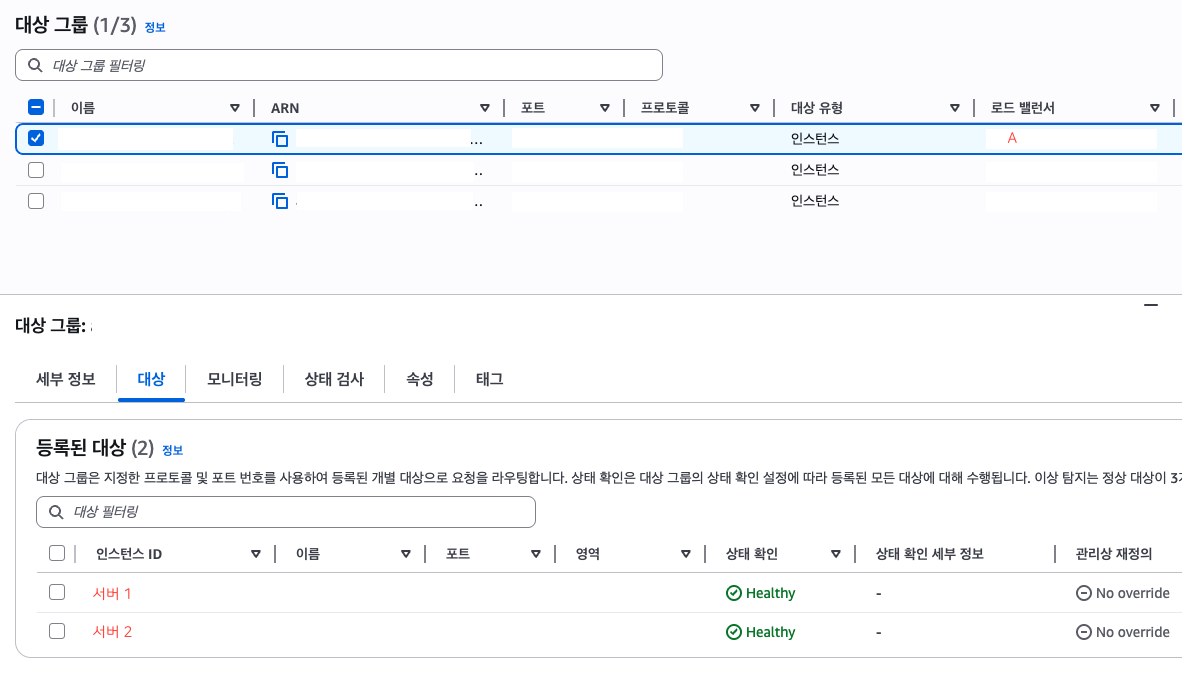 선택 후, 대상을 누르면 등록된 대상이 나옵니다! 이 목록에서 1번에서 확인했던 본 서버의 인스턴스 ID가 동일한지 확인하면 됩니다!